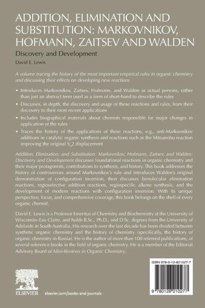 Addition, Elimination and Substitution: Markovnikov, Hofmann, Zaitsev and Walden: Discovery and Development discusses foundational reactions in organic chemistry and their major protagonists, contributions to synthesis, and history. Hofmann, Zaitsev, and Markovnikov are introduced, along with their major discoveries and contributions to organic chemistry. The history of controversies around Markovnikov's Rule are addressed. The book introduces Walden's original demonstration of configuration inversion, then discusses bimolecular elimination reactions, regioselective addition reactions, regiospecific alkene synthesis, and the development of modern reactions with configuration inversion. With its unique perspective, focus, and comprehensive coverage, this book belongs on the shelf of every organic chemist.