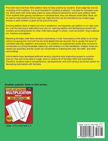 This book has more than 4000 addition facts for daily practice by students. Each page has one set consisting of 45 problems. It is recommended for students to attempt 1 set daily for consistent practice. Book starts with times table charts for easy reference followed by some quick addition facts. Once students start gaining confidence in individual facts, they can attempt mixed facts. Book can be used to track practice time for each set. Date and time can be recorded at top of each page. Answer to each problem is given at the end of the book.Knowing addition facts is helpful not only in academics; we frequently use addition in our daily lives too. Just like learning to walk before you can run, learning addition and familiarizing yourself with numbers are building blocks for other math topics taught in school - such as division, long multiplication, fractions and algebra.Mastering the basic math facts develops automaticity in kids. Automaticity is the ability to do things without occupying the mind with the low level details that are required; this is usually the result of consistent learning, repetition, and practice. For instance, an experienced cyclist does not have to concentrate on turning the pedals, balancing, and holding on to the handlebars. Instead, those processes are automatic and the cyclist can concentrate on watching the road, the traffic, and other surroundings.Until students have developed sufficient sensory-cognitive tools supporting access to symbolic memory, they will not be able to image, store or retrieve all of the basic facts with automaticity. Therefore, students need a comprehensive, developmental, and multi-sensory structured system for developing automaticity with the facts.