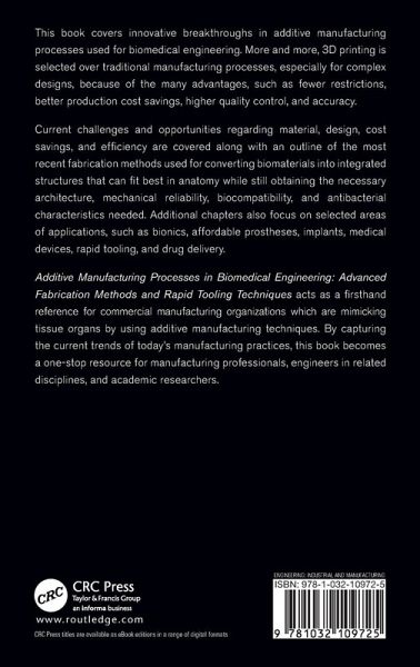 This book covers innovative breakthroughs in additive manufacturing processes used for biomedical engineering. More and more 3D printing is selected over traditional manufacturing processes especially for complex designs because of the many advantages such as less restrictions, better production cost savings, higher quality control, and accuracy.
