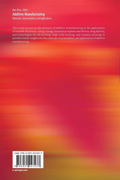 3D printed wearable electronics: techniques, materials, and applications.- Additive manufacturing of energy storage devices.- 4D printing of stimuli-responsive materials.- Personalized medicine: manufacturing oral solid dosage forms through additive manufacturing.- Additive manufacturing of metal implants and surgical plates.- Wire arc additive manufacturing: systems, microstructure, defects, quality control, and modelling.- Additive manufacturing of ceramics: materials, characterization and applications.