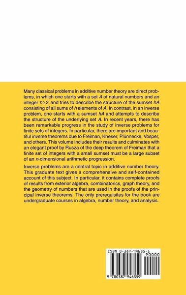 Many classical problems in additive number theory are direct problems, in which one starts with a set A of natural numbers and an integer H -> 2, and tries to describe the structure of the sumset hA consisting of all sums of h elements of A. By contrast, in an inverse problem, one starts with a sumset hA, and attempts to describe the structure of the underlying set A. In recent years there has been ramrkable progress in the study of inverse problems for finite sets of integers. In particular, there are important and beautiful inverse theorems due to Freiman, Kneser, Plünnecke, Vosper, and others. This volume includes their results, and culminates with an elegant proof by Ruzsa of the deep theorem of Freiman that a finite set of integers with a small sumset must be a large subset of an n-dimensional arithmetic progression.
