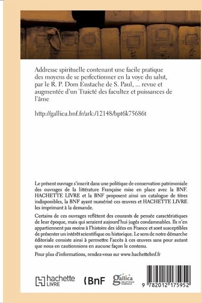 Addresse spirituelle contenant une facile pratique des moyens de se perfectionner en la voye du salut , par le R. P. Dom Eustache de S. Paul,... reveue et augmentee d'un Traicte des facultez et puissances de l'ameCe livre est la reproduction fidele d'une oeuvre publiee avant 1920 et fait partie d'un projet propose par la Bibliotheque nationale de France (BnF), offrant l'opportunite pour les lecteurs, enseignants ou chercheurs d'acceder a des ouvrages anciens et souvent rares issus de ses fonds patrimoniaux.Les oeuvres de cette collection appartiennent au domaine public . Elles ont ete numerisees par la BnF et sont presentes sur Gallica, la bibliotheque numerique de la BnF.En entreprenant de redonner vie a ces oeuvres au travers d'une collection de livres reimprimes a la demande, nous offrons la possibilite a ces oeuvres de rencontrer un public elargi et participons a la transmission de connaissances et de savoirs difficilement accessibles par ailleurs.Sur un plan technique, nous avons cherche a concilier la reproduction fidele d'un livre ancien a partir de sa version numerisee avec le souci d'un confort de lecture optimal. Nous esperons que les ouvrages de cette nouvelle collection vous apporteront entiere satisfaction.http://gallica.bnf.fr/ark:/12148/bpt6k75686t