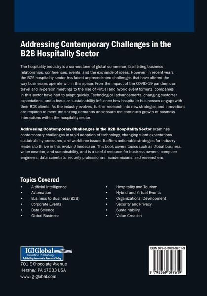 The hospitality industry is a cornerstone of global commerce, facilitating business relationships, conferences, events, and the exchange of ideas. However, in recent years, the B2B hospitality sector has faced unprecedented challenges that have altered the way businesses operate within this space. From the impact of the COVID-19 pandemic on travel and in-person meetings to the rise of virtual and hybrid event formats, companies in this sector have had to adapt quickly. Technological advancements, changing customer expectations, and a focus on sustainability influence how hospitality businesses engage with their B2B clients. As the industry evolves, further research into new strategies and innovations are required to meet the shifting demands and ensure the continued growth of business interactions within the hospitality sector. Addressing Contemporary Challenges in the B2B Hospitality Sector examines contemporary challenges in rapid adoption of technology, changing client expectations, sustainability pressures, and workforce issues. It offers actionable strategies for industry leaders to thrive in this evolving landscape. This book covers topics such as global business, value creation, and sustainability, and is a useful resource for business owners, computer engineers, data scientists, security professionals, academicians, and researchers.