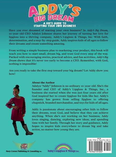 "Addy's Big Dream: A Kid's Guide to Starting Your Own Business with God" Have you ever dreamed of starting your own business? In Addy's Big Dream, 10-year-old CEO Adalyn Johnson shares her journey of turning her love for lipgloss into a thriving company, Addy's Lipgloss & Things, Inc. With faith, determination, and a step-by-step guide, Addy inspires kids of all ages to follow their dreams and create something amazing. From writing a simple business plan to marketing your product, this book will teach you how to start small, dream big, and trust God every step of the way. Packed with encouraging stories, practical advice, and fun activities, Addy's Big Dream shows that it's never too early to become a CEO. Remember, with God, nothing is impossible! Are you ready to take the first step toward your big dream? Let Addy show you how! About the Author Adalyn "Addy" Johnson is no ordinary 10-year-old. She's the founder and CEO of Addy's Lipgloss & Things, Inc., a business she started when she was just four years old after God inspired her to create lipgloss for kids like her. Addy's company has grown from selling lipgloss to offering chapstick, branded merchandise, and toys for kids of all ages. Addy is passionate about encouraging other kids to follow their dreams, trust God, and believe that they can achieve anything. When she's not working on her business, Addy loves singing, dancing, exploring new ideas, and spending time with her family. Through her story and guidance, Addy hopes to inspire kids everywhere to dream big and take action, no matter how young they are.