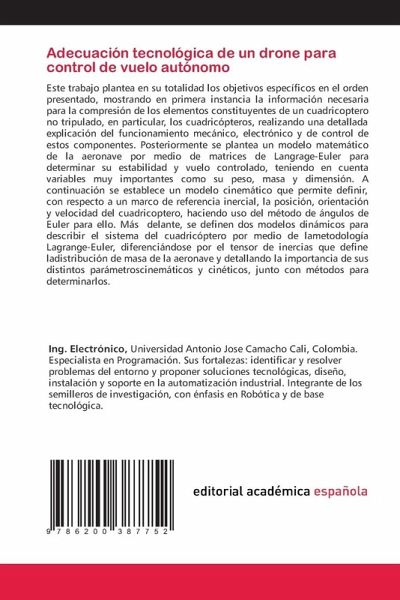 Este trabajo plantea en su totalidad los objetivos específicos en el orden presentado, mostrando en primera instancia la información necesaria para la compresión de los elementos constituyentes de un cuadricoptero no tripulado, en particular, los cuadricópteros, realizando una detallada explicación del funcionamiento mecánico, electrónico y de control de estos componentes. Posteriormente se plantea un modelo matemático de la aeronave por medio de matrices de Langrage-Euler para determinar su estabilidad y vuelo controlado, teniendo en cuenta variables muy importantes como su peso, masa y dimensión. A continuación se establece un modelo cinemático que permite definir, con respecto a un marco de referencia inercial, la posición, orientación y velocidad del cuadricoptero, haciendo uso del método de ángulos de Euler para ello. Más delante, se definen dos modelos dinámicos para describir el sistema del cuadricóptero por medio de lametodología Lagrange-Euler, diferenciándose por el tensor de inercias que define ladistribución de masa de la aeronave y detallando la importancia de sus distintos parámetroscinemáticos y cinéticos, junto con métodos para determinarlos.