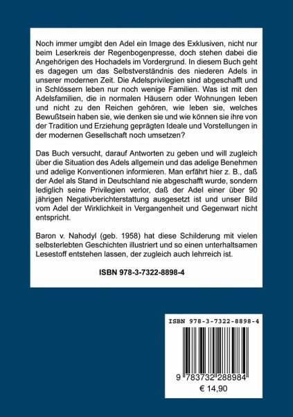 Noch immer umgibt den Adel ein Image des Exklusiven, nicht nur beim Leserkreis der Regenbogenpresse, doch stehen dabei die Angehörigen des Hochadels im Vordergrund. In diesem Buch geht es dagegen um das Selbstverständnis des niederen Adels in unserer modernen Zeit. Die Adelsprivilegien sind abgeschafft und in Schlössern leben nur noch wenige Familien. Was ist mit den Adelsfamilien, die in normalen Häusern oder Wohnungen leben und nicht zu den Superreichen gehören, wie leben sie, welches Bewußtsein haben sie, wie denken sie und wie können sie ihre von der Tradition und Erziehung geprägten Ideale und Vorstellungen in der modernen Gesellschaft noch umsetzen?Das Buch versucht, darauf Antworten zu geben und will gleichzeitig über die Situation des Adels allgemein und das adelige Benehmen und adelige Konventionen informieren. Man erfährt hier z. B., daß der Adel als Stand in Deutschland nie abgeschafft wurde, sondern lediglich seine Privilegien verlor, daß der Adel einer über 90 jährigen Negativberichterstattung ausgesetzt ist und unser Bild vom Adel der Wirklichkeit in Vergangenheit und Gegenwart nicht entspricht. Baron v. Nahodyl (geb. 1958) hat diese Schilderung mit vielen selbst erlebten Geschichten illustriert und so einen unterhaltsamn Lesestoff entstehen lassen, der zugleich auch lehrreich ist.