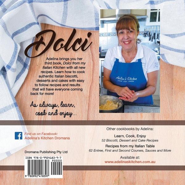 Adelina’s third cookbook, in response to her popular first Dessert book "Learn Cook Enjoy" offers all new recipes born from her love of cooking and years of experience. Dolci From My Italian Kitchen encourages you to enjoy authentic Italian cuisine at home. Includes some Gluten Free Recipes and all recipes are written side-by- side in both English and Italian with mouth-watering full colour images. The author: Born in small Calabrian village in southern Italy, Adelina started cooking for her family at a young age. Adelina and her family migrated to Australia when she was a teenager and her passion for cooking truly began. She enrolled at the William Angliss TAFE College and became a qualified chef. After graduating Adelina worked at Campari Bistro as Head Chef, Scusami Ristorante, where she specialised in regional Italian cuisine and desserts. Adelina then joined EnotecaVino Bar as a pastry Chef where she created a range of traditional Italian biscotti, cakes, desserts and handmade pasta. Today Adelina has a Cooking School for Italian Cuisine on Victoria’s Mornington Peninsula in Australia. Reasons to Buy: Bilingual - Italian and English Full colour images Easy to follow recipes that work Written by a qualified and experienced chef Perfect for food lovers and those interested in Italian cuisine Includes Gluten Free recipes
