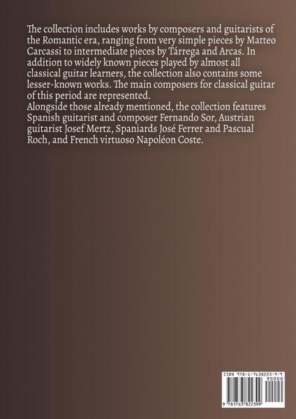 The collection includes works by composers and guitarists of the Romantic era, ranging from very simple pieces by Matteo Carcassi to intermediate pieces by Tárrega and Arcas. In addition to widely known pieces played by almost all classical guitar learners, the collection also contains some lesser-known works. The main composers for classical guitar of this period are represented. Alongside those already mentioned, the collection features Spanish guitarist and composerFernando Sor, Austrian guitarist Josef Mertz, Spaniards José Ferrer and Pascual Roch, and French virtuoso Napoléon Coste.