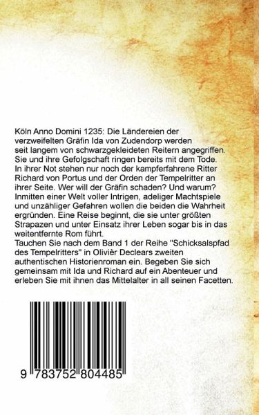 Köln Anno Domini 1235: Die Ländereien der verzweifelten Gräfin Ida von Zudendorp werden seit langem von schwarzgekleideten Reitern angegriffen. Sie und ihre Gefolgschaft ringen bereits mit dem Tode. In ihrer Not stehen nur noch der kampferfahrene Ritter Richard von Portus und der Orden der Tempelritter an ihrer Seite. Wer will der Gräfin schaden? Und warum? Inmitten einer Welt voller Intrigen, adeliger Machtspiele und unzähliger Gefahren wollen die beiden die Wahrheit ergründen. Eine Reise beginnt, die sie unter größten Strapazen und unter Einsatz ihrer Leben sogar bis in das weitentfernte Rom führt. Tauchen Sie nach dem Band 1 der Reihe - Schicksalspfad des Tempelritters -, in Olivièr Declears zweiten authentischen Historienroman ein. Begeben Sie sich gemeinsam mit Ida und Richard auf ein Abenteuer und erleben Sie mit ihnen das Mittelalter in all seinen Facetten.