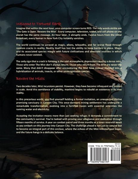 Welcome to Tortured Earth Imagine that within the next hour, your computer screen turns RED. The only words visible are 'The Gate is Open. Beware the Mist'. Every computer, television, tablet, and cell phone on the planet has the same message. An hour later, it abruptly ends. Twelve hours from the initial Broadcast, every human in New York City instantly vanishes. The world continues to unravel as magic, aliens, telepaths, and far worse flood through random cracks in reality. Reality itself has lost the ability to keep barriers in place. Magic and its associated species mingle with future civilizations and alternate realities in which humans never existed. The only sign that a crack is forming is the odd atmospheric depression causing a dense mist. Those who enter The Mist don't always return. Those who return from The Mist are never the same. Many that didn't disappear after encountering the Mist have instead mutated into a hybridization of animals, insects, or other unrecognizable species. Beware the Mists Two decades later, Mist incursions persist. However, they have become infrequent and limited in scale. Amid this semblance of stability, mankind begins to rebuild an existence in its new reality. In this precarious world, you find yourself holding a formal invitation, an unexpected lifeline promising sanctuary in Canyon City. This once-dormant mining settlement has undergone a remarkable transformation, evolving into a fortified haven with essential amenities like running water and electricity. Accepting the invitation means more than just seeking refuge; it demands a commitment to the community's survival. You're tasked with proving your allegiance and dedication through fifteen months of service. A year on combat patrol and three months as a town reservist await as you embark on this journey into Canyon City. The challenge ahead is not just to survive but to become an integral part of this enclave, where the echoes of the Mist-infested past linger, and the future hangs in a delicate balance.