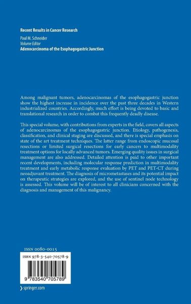 Among malignant tumors, adenocarcinomas of the esophagogastric junction show the highest increase in incidence over the past three decades in Western industrialized countries. This special volume, with contributions from experts in the field, covers all aspects of the disease. Etiology, pathogenesis, classification, and clinical staging are discussed, and there is special emphasis on state of the art treatment techniques. The latter range from endoscopic mucosal resections or limited surgical resections for early cancers to multimodality treatment options for locally advanced tumors. Emerging quality issues in surgical management are addressed. Detailed attention is also paid to other important recent developments, including molecular response prediction, early metabolic response evaluation by PET and PET-CT, the diagnosis of micrometastases, and the use of sentinel node technology. This volume will be of interest to all clinicians concerned with the diagnosis and management of this malignancy.