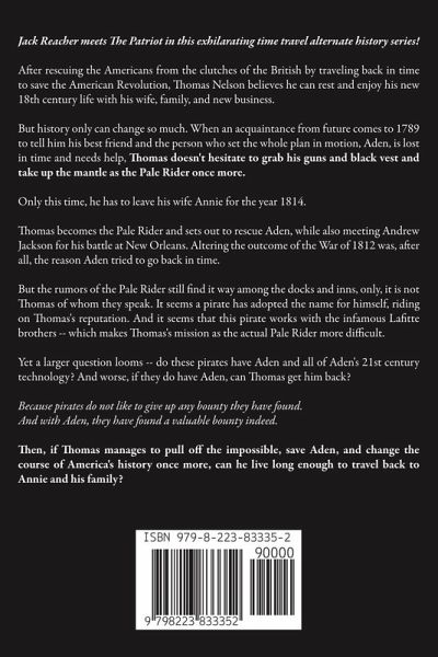 Jack Reacher meets The Patriot in this exhilarating time travel alternate history series! After rescuing the Americans from the clutches of the British by traveling back in time to save the American Revolution, Thomas Nelson believes he can rest and enjoy his new 18th century life with his wife, family, and new business. But history only can change so much. When an acquaintance from future comes to 1789 to tell him his best friend and the person who set the whole plan in motion, Aden, is lost in time and needs help, Thomas doesn't hesitate to grab his guns and black vest and take up the mantle as the Pale Rider once more. Only this time, he has to leave his wife Annie for the year 1814. Thomas becomes the Pale Rider and sets out to rescue Aden, while also meeting Andrew Jackson for his battle at New Orleans. Altering the outcome of the War of 1812 was, after all, the reason Aden tried to go back in time. But the rumors of the Pale Rider still find it way among the docks and inns, only, it is not Thomas of whom they speak. It seems a pirate has adopted the name for himself, riding on Thomas's reputation. And it seems that this pirate works with the infamous Lafitte brothers -- which makes Thomas's mission as the actual Pale Rider more difficult. Yet a larger question looms -- do these pirates have Aden and all of Aden's 21st century technology? And worse, if they do have Aden, can Thomas get him back? Because pirates do not like to give up any bounty they have found. And with Aden, they have found a valuable bounty indeed. Then, if Thomas manages to pull off the impossible, save Aden, and change the course of America's history once more, can he live long enough to travel back to Annie and his family? Aden's Chance is the fourth book in the Pale Rider series, an alternate American Historical Military retelling, and is the first book in the next trilogy set which focuses on the War of 1812. If you like American history, time travel, and alternate historical fiction, then discover Aden's Chance today! ** it is recommended that the books are read in order! **