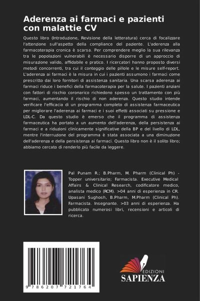 Questo libro (Introduzione, Revisione della letteratura) cerca di focalizzare l'attenzione sull'aspetto della compliance del paziente. L'aderenza alla farmacoterapia cronica è scarsa. Per comprendere meglio la sua rilevanza tra le popolazioni vulnerabili è necessario disporre di un approccio di misurazione valido, affidabile e pratico. I ricercatori hanno proposto diversi metodi concorrenti, tra cui il conteggio delle pillole e le misure self-report. L'aderenza ai farmaci è la misura in cui i pazienti assumono i farmaci come prescritto dai loro fornitori di assistenza sanitaria. Una scarsa aderenza ai farmaci riduce i benefici della farmacoterapia per la salute. I pazienti anziani con fattori di rischio coronarico richiedono spesso un trattamento con più farmaci, aumentando il rischio di non aderenza. Questo studio intende verificare l'efficacia di un programma completo di assistenza farmaceutica per migliorare l'aderenza ai farmaci e i suoi effetti associati su pressione e LDL-C. Da questo studio è emerso che il programma di assistenza farmaceutica ha portato a un aumento dell'aderenza, della persistenza ai farmaci e a riduzioni clinicamente significative della BP e del livello di LDL, mentre l'interruzione del programma è stata associata a una diminuzione dell'aderenza e della persistenza ai farmaci. Questo libro non è il solito libro; abbiamo cercato di renderlo più facile da leggere.