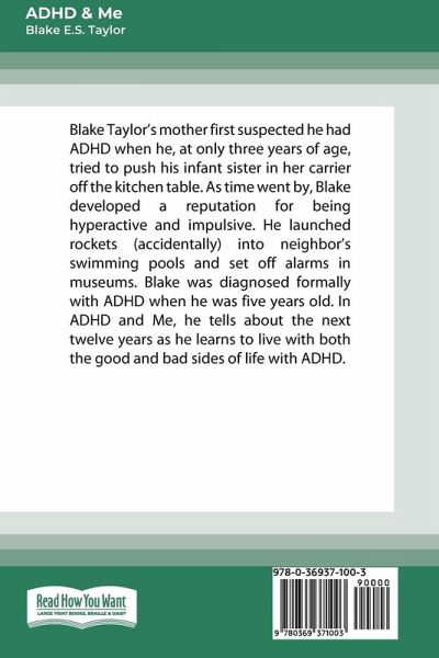 Blake Taylor's mother first suspected he had ADHD when he, at only three years of age, tried to push his infant sister in her carrier off the kitchen table. As time went by, Blake developed a reputation for being hyperactive and impulsive. He launched rockets (accidentally) into neighbor's swimming pools and set off alarms in museums. Blake was diagnosed formally with ADHD when he was five years old. In ADHD and Me, he tells about the next twelve years as he learns to live with both the good and bad sides of life with ADHD.