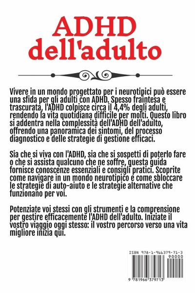 ADHD dell'adulto In un mondo costruito per, da e intorno agli adulti neurotipici, le persone con disturbi del neurosviluppo spesso lottano per farcela. È sempre compito di coloro che si trovano ai margini capire e inserirsi in un mondo che per loro ha poco senso. La comunità scientifica e psichiatrica non comprende ancora molte delle complessità della salute mentale. Ad esempio, l'ADHD è stato riconosciuto come disturbo mentale solo negli anni '60. La ricerca su questo disturbo ha fatto passi da gigante. La ricerca su questo disturbo ha fatto molta strada, ma molti ostacoli devono ancora essere superati. L'obiettivo di questo libro è quello di contribuire a una migliore educazione specifica sull'ADHD dell'adulto. In definitiva, questo libro mira a portare aiuto al 4,4% degli adulti che lottano contro l'ADHD dell'adulto. Al suo interno troverete informazioni sui sintomi dell'ADHD, sulle modalità di diagnosi quando vi recate da un medico, sulla gestione dell'ADHD dell'adulto e sulle strategie di auto-aiuto e alternative disponibili per gestire l'ADHD da adulti. Vivete personalmente con l'ADHD da adulti? O forse sospettate di esserlo, ma non avete ricevuto una diagnosi ufficiale? O ancora, vivete o lavorate con qualcuno che ha a che fare con l'ADHD? Se avete risposto "Sì" a una delle domande precedenti, questo libro è per voi! Scorri verso l'alto e premi "Acquista ora" per saperne di più sull'ADHD dell'adulto e su come può essere trattato, oggi stesso!