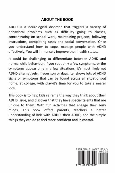Life with a kid with ADHD can be frustrating and overwhelming, but as a mother or father, there's a lot you can certainly do to help control symptoms, overcome daily problems, and bring greater calm to your loved ones. What if you could work with your child, motivating and engage your kids in the process, to create positive change once and for all? ADHD is a neurological disorder that triggers a variety of behavioral problems such as difficulty going to classes, concentrating on school work, maintaining projects, following instructions, completing tasks and social conversation. Once you understand how to cope, manage people with ADHD effectively, You will immensely improve their health status. It could be challenging to differentiate between ADHD and normal child behaviour. If you spot only a few symptoms, or the symptoms appear only in a few situations, it's most likely not ADHD alternatively, if your son or daughter shows lots of ADHD signs or symptoms that can be found across all situations-at home, at college, with play-it's time for you to take a nearer look. This book is to help kids reframe the way they think about their ADHD issue, and discover that they have special talents that are unique to them. With fun activities that engage their busy minds, This book offers parents, teachers a better understanding of kids with ADHD, their ADHD, and the simple things they can do to feel more confident and in control...