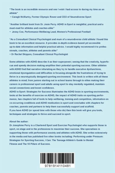 Dr Josephine Perry is a Chartered Sport and Exercise Psychologist who supports those in sport, on stage and in the professions to maximise their success. She specialises in supporting those with performance anxiety and athletes with ADHD. She writes extensively in the media and has published five other books including: Performing under Pressure: Strategies for Sporting Success, ICan: The Teenage Athlete's Guide to Mental Fitness and The 10 Pillars of Success.