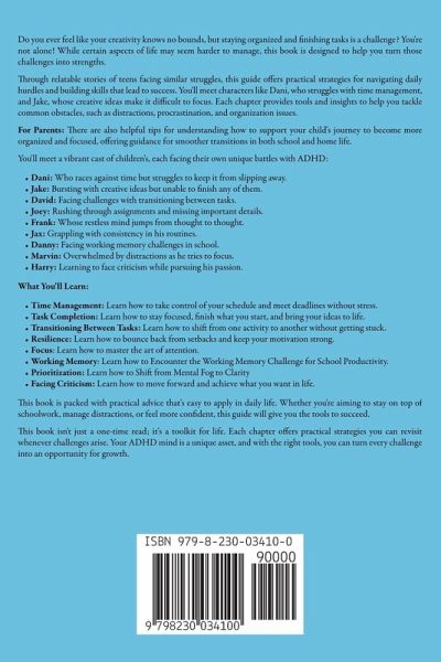 Do you ever feel like your creativity knows no bounds, but staying organized and finishing tasks is a challenge? You're not alone! While certain aspects of life may seem harder to manage, this book is designed to help you turn those challenges into strengths. Through relatable stories of teens facing similar struggles, this guide offers practical strategies for navigating daily hurdles and building skills that lead to success. You'll meet characters like Dani, who struggles with time management, and Jake, whose creative ideas make it difficult to focus. Each chapter provides tools and insights to help you tackle common obstacles, such as distractions, procrastination, and organization issues. For Parents: There are also helpful tips for understanding how to support your child's journey to become more organized and focused, offering guidance for smoother transitions in both school and home life. You'll meet a vibrant cast of children's, each facing their own unique battles with ADHD: Dani: Who races against time but struggles to keep it from slipping away. Jake: Bursting with creative ideas but unable to finish any of them. David: Facing challenges with transitioning between tasks. Joey: Rushing through assignments and missing important details. Frank: Whose restless mind jumps from thought to thought. Jax: Grappling with consistency in his routines. Danny: Facing working memory challenges in school. Marvin: Overwhelmed by distractions as he tries to focus. Harry: Learning to face criticism while pursuing his passion. What You'll Learn: Time Management: Learn how to take control of your schedule and meet deadlines without stress. Task Completion: Learn how to stay focused, finish what you start, and bring your ideas to life. Transitioning Between Tasks: Learn how to shift from one activity to another without getting stuck. Resilience: Learn how to bounce back from setbacks and keep your motivation strong. Focus: Learn how to master the art of attention. Working Memory: Learn how to Encounter the Working Memory Challenge for School Productivity. Prioritization: Learn how to Shift from Mental Fog to Clarity Facing Criticism: Learn how to move forward and achieve what you want in life. This book is packed with practical advice that's easy to apply in daily life. Whether you're aiming to stay on top of schoolwork, manage distractions, or feel more confident, this guide will give you the tools to succeed. This book isn't just a one-time read; it's a toolkit for life. Each chapter offers practical strategies you can revisit whenever challenges arise. Your ADHD mind is a unique asset, and with the right tools, you can turn every challenge into an opportunity for growth.
