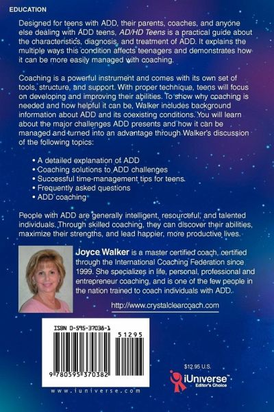 Designed for teens with ADD, their parents, coaches, and anyone else dealing with ADD teens, AD/HD Teens is a practical guide about the characteristics, diagnosis, and treatment of ADD. It explains the multiple ways this condition affects teenagers and demonstrates how it can be more easily managed with coaching. Coaching is a powerful instrument and comes with its own set of tools, structure, and support. With proper technique, teens will focus on developing and improving their abilities. To show why coaching is needed and how helpful it can be, Walker includes background information about ADD and its coexisting conditions.You will learn about the major challenges ADD presents and how it can be managed and turned into an advantage through Walker's discussion of the following topics: * A detailed explanation of ADD * Coaching solutions to ADD challenges * Successful time-management tips for teens * Frequently asked questions * ADD coaching People with ADD are generally intelligent, resourceful, and talented individuals. Through skilled coaching, they can discover their abilities, maximize their strengths, and lead happier, more productive lives.
