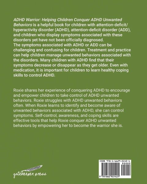 ADHD Warrior: Helping Children Conquer ADHD Unwanted Behaviors is a helpful book for children with attention-deficit/hyperactivity disorder (ADHD), attention-deficit disorder (ADD), and children who display symptoms associated with these disorders yet have not been officially diagnosed. The symptoms associated with ADHD or ADD can be challenging and confusing for children. Treatment and practice can help children manage unwanted behaviors associated with the disorders. Many children with ADHD find that their symptoms decrease or disappear as they get older. Even with medication, it is important for children to learn healthy coping skills to control ADHD. Roxie shares her experience of conquering ADHD to encourage and empower children to take control of ADHD unwanted behaviors. Roxie struggles with ADHD unwanted behaviors often. When Roxie learns to identify and become aware of unwanted behaviors associated with ADHD, she can control symptoms. Self-control, awareness, and coping skills are effective tools that help Roxie conquer ADHD unwanted behaviors by empowering her to become the warrior she is.
