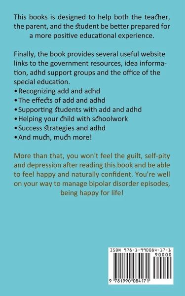 This books is designed to help both the teacher, the parent, and the student be better prepared for a more positive educational experience. Finally, the book provides several useful website links to the government resources, idea information, adhd support groups and the office of the special education. · Recognizing add and adhd · The effects of add and adhd · Supporting students with add and adhd · Helping your child with schoolwork · Success strategies and adhd · And much, much more! More than that, you won't feel the guilt, self-pity and depression after reading this book and be able to feel happy and naturally confident. You're well on your way to manage bipolar disorder episodes, being happy for life!