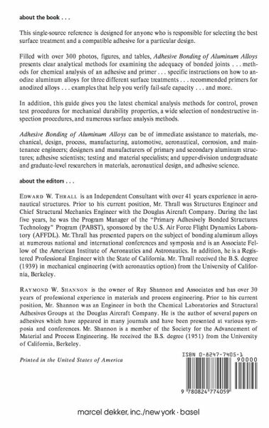 This single-source reference is designed for anyone who is responsible for selecting the bestsurface treatment and a compatible adhesive for a particular design.Filled with over 300 photos, figures, and tables, Adhesive Bonding of Aluminum Alloyspresents clear analytical methods for examining the adequacy of bonded joints ... methodsfor chemical analysis of an adhesive and primer ... specific instructions on how to anodizealuminum alloys for three different surface treatments .. . recommended primers foranodized alloys ... examples that help you verify fail-safe capacity ... and more.In addition, this guide gives you the latest chemical analysis methods for control, proventest procedures for mechanical durability properties, a wide selection of nondestructive inspectionprocedures, and numerous surface analysis methods.Adhesive Bonding of Aluminum Alloys can be of immediate assistance to materials, mechanical,design, process, manufacturing, automotive, aeronautical, corrosion, and maintenanceengineers; designers and manufacturers of primary and secondary aluminum structures;adhesive scientists; testing and material specialists; and upper-division undergraduateand graduate-level researchers in materials, aeronautical design, and adhesive science.
