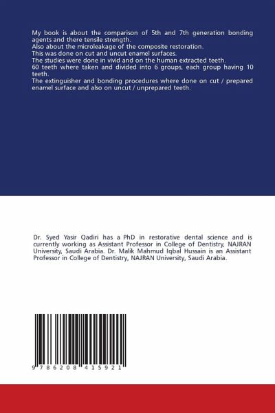 My book is about the comparison of 5th and 7th generation bonding agents and there tensile strength.Also about the microleakage of the composite restoration.This was done on cut and uncut enamel surfaces.The studies were done in vivid and on the human extracted teeth. 60 teeth where taken and divided into 6 groups, each group having 10 teeth.The extinguisher and bonding procedures where done on cut / prepared enamel surface and also on uncut / unprepared teeth.