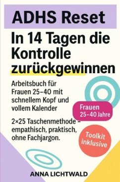 Sie haben einen schnellen Verstand und einen vollen Terminkalender, aber es kostet Sie Energie, anzufangen und konzentriert zu bleiben?ADHD Reset ist ein praktischer 14-tägiger Kurs für Frauen zwischen 25 und 40, die Prokrastination und Überlastung reduzieren möchten, ohne ihr Leben auf den Kopf zu stellen. Das Herzstück ist die 2×25-Methode: zwei kurze Sprints, eine regenerierende Pause und eine grundlegende Überprüfung. Sie starten in 60 Sekunden, arbeiten monoton und schließen jeden Tag etwas Sichtbares ab.Was Sie konkret lernen-Starten Sie sofort mit der geführten ersten Minute und überwinden Sie die Startlatenz-Nutzen Sie Parking und If/Then-Skripte, um Ablenkungen zu blockieren-Nutzen Sie das leichte Body-Double, um zuverlässig zu bleiben, ohne endlose Besprechungen-Planen Sie F1/F2 mit Timeboxing und realistischen Puffern-Messen Sie mit einfachen KPIs und passen Sie jeweils nur einen Hebel anMessbares Versprechen (ohne Fachjargon)Innerhalb von 14 Tagen streben Sie an: +10-30' echte Konzentration/Tag, Latenz 2' an mehr als 5 Tagen, Scrollen <60'/Tag. Alles wird mit übersichtlichen Tabellen und Überprüfungen nach der Hälfte und am Ende des Weges verfolgt.Operatives Kit inklusiveTabelle "Heute", Baseline & Setup, Wochenplaner, 20 Wenn-Dann-Skripte, Body-Double-Vorlage, Taschenkarte "NO-Tag - 15'", Poster 3:4 "2×25 Fokus-Schleife".Ein einfühlsames und praktisches Handbuch, ohne Schnickschnack: zwei Sprints auf einmal, Ergebnisse, die man sieht.Beginnen Sie noch heute mit Tag 0 - Einrichtung in 15' und übernehmen Sie wieder die Kontrolle.Ethischer Hinweis: Dieses Buch ersetzt keine medizinische/psychologische Diagnose oder Behandlung.