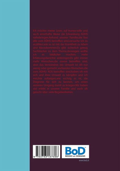 Ich möchte meine Leser, auf humorvolle und auch ernsthafte Weise die Erkrankung ADHS nahebringen. Anhand unserer Familie, die fast alle vom ADHS betroffen sind, versuche ich zu erzählen, wie es ist mit der Krankheit zu leben und klarzukommen. Es gibt sicherlich genug Sachbücher zu dem Thema, deswegen wollte ich es bildlicher machen, mehr Erfahrungsberichte einbringen. Es gibt immer mehr Menschen, die davon betroffen sind, aber das Verständnis der Umwelt ist oft nur wenig oder gar nicht vorhanden. Menschen, die vom ADHS/ ADS betroffen sind, haben oft mit sich und ihrer Umwelt zu kämpfen und ich möchte aufzeigen, wie wichtig es ist, die Diagnose für sich zu kennen, um einen anderen Umgang damit zu kriegen. Wir haben viel erlebt in unserer Familie und auch oft gelacht über viele Begebenheiten.