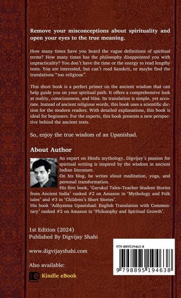 Remove your misconceptions about spirituality and open your eyes to the true meaning. Adhyatma Upanishad is one of the most important Upanishads of Hinduism. Its teachings are not just about spirituality but also comprise modern science and mathematics. With its lucid translation and well-researched commentary, you will get a holistic view of the essence of spirituality. How many times have you heard the vague definitions of spiritual terms? How many times has the philosophy disappointed you with unpracticality? You don't have the time or the energy to read lengthy texts. You are interested, but can't read Sanskrit, or maybe find the translations too religious. This short book is a perfect primer on the ancient wisdom that can help guide you on your spiritual path. It offers a comprehensive look at reality, consciousness, and bliss. Its translation is simple, yet accurate. Instead of ancient religious words, this book uses a scientific diction for the modern readers. So, enjoy the true wisdom of an Upanishad. About Adhyatma Upanishad This Upanishad compiles the knowledge of Shukla-Yajurveda. It talks about the supreme spirit in oneself. It shows how losing desire for the material leads to liberation in life called 'living-freedom'. Dedication to the singular and the universal destroys all past accumulated actions. By realizing the soul within, one attains samadhi 'balanced state' and becomes one with the universal soul. Start becoming the best version of yourself!