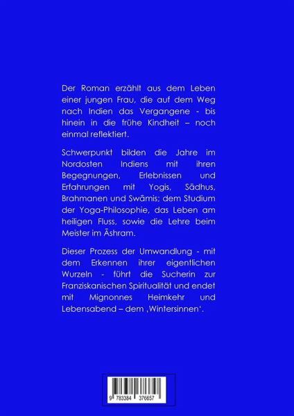 Karoline Marie-Louise Seitz ist examinierte Altenpflegerin im Ruhestand und ehemalige Absolventin einer privaten Gesangsausbildung bei einem Professor der Musikhochschule München.1948 geboren, hat sie die Kindheit und Jugend in Südhessen verbracht. Nach ihrer Heirat erfolgte der Umzug nach Bayern und die Adoption eines Geschwisterpaares.Ihr Interesse am Yoga führte sie in einem Zeitraum von 12 Jahren zu regelmäßigen Reisen nach Indien - mit längeren Aufenthaltsintervallen bis zu einem Jahr und einem von 3 Jahren.Seit 1997 ist sie Mitglied des Franziskanischen Laienordens OFS (Ordo Franciscanus Saecularis).Der bisher einzige Roman ist zwischen 2020-22 während der Corona-Pandemiezeit am aktuellen Altersruhesitz in Baden-Württemberg entstanden.Der Roman erzählt aus dem Leben einer jungen Frau, die auf dem Weg nach Indien das Vergangene - bis hinein in die frühe Kindheit - noch einmal reflektiert.Schwerpunkt bilden die Jahre im Nordosten Indiens mit ihren Begegnungen, Erlebnissen undErfahrungen mit Yogis, Sadhus, Brahmanen und Swamis; dem Studium der Yoga-Philosophie, das Leben am heiligen Fluss, sowie die Lehre beim Meister im Ashram.Dieser Prozess der Umwandlung - mit dem Erkennen ihrer eigentlichen Wurzeln - führt die Sucherin zur Franziskanischen Spiritualität und endet mit Mignonnes Heimkehr und Lebensabend - dem 'Wintersinnen'.