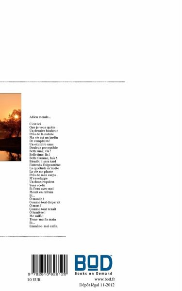 Adieu monde...La vieEst vomissureOn se lèveDans l'incertainDes lassantesAccoutumancesOn butineLes fleurs de l'ennuiEt le soleil dansNos yeux obscurcisDes équivoquesAu son de beffroiPourquoi la sociétéNous emprisonneEt ces lois quiAu conflitNous mènentOù est doncL'amour du prochainJe suis malEn votre présenceVous me jugezJournellementTout s'évade en moiMêmes mesÉmotions premièresJe n'ai plus de souvenirsLa vie m'a violéEt a pris mon essenceJ'ai perdu volontéEt clairvoyanceJe m'en vaisPour espérer mourirAvant queLe monde me tueEt...