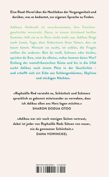 Eine Road-Novel über die Nachleben der Vergangenheit und darüber, was es bedeutet, zur eigenen Sprache zu finden: «Adikou war mir nach wenigen Seiten vertraut, als wäre sie schon immer da gewesen, dabei ist jeder von Raphaëlle Reds Sätzen von neuer, nie da gewesener Schönheit.» (Dana Vowinckel)