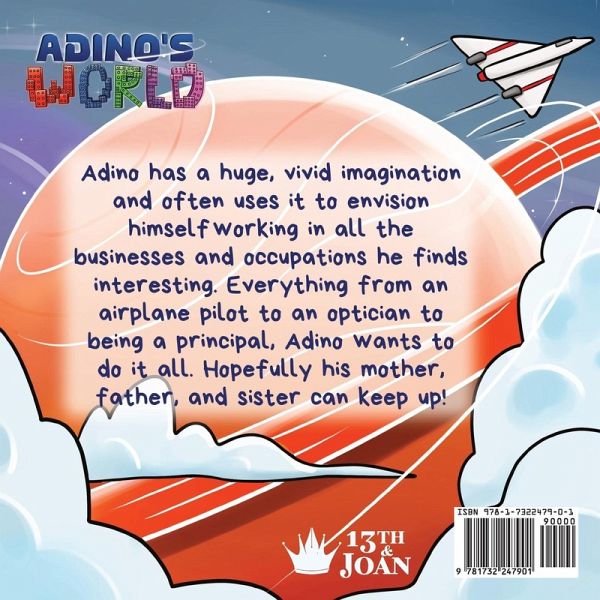 Adino has a huge, vivid imagination and often uses it to envision himself working in all the businesses and occupations he finds interesting. Everything from an airplane pilot to an optician to being a principal. Adino wants to do it all. Hopefully his mother, father, and sister can keep up!