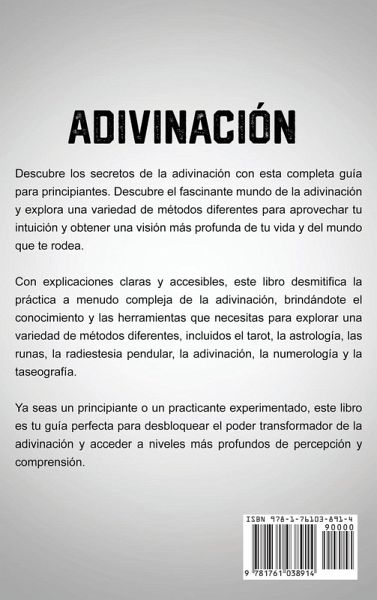 Adivinación Desbloquea el poder de la adivinación con esta completa guía para principiantes. ¿Buscas una visión más profunda de tu vida y del mundo que te rodea? ¡No busques más allá del fascinante mundo de la adivinación! La adivinación es una práctica poderosa y transformadora que puede ayudarte a aprovechar tu intuición y obtener una visión más profunda de tu vida y el mundo que te rodea. En esta completa guía, aprenderás: · Los conceptos básicos de una variedad de diferentes métodos de adivinación, incluidos el tarot, la astrología, las runas, la radiestesia del péndulo, la adivinación, la numerología y la taseografía. · Cómo utilizar cada uno de estos métodos para obtener niveles más profundos de autoconciencia y comprensión, y desbloquear el poder transformador de la adivinación. · Consejos y trucos para principiantes, para ayudarte a comenzar con cada una de estas prácticas y comenzar a aprovechar tu intuición con confianza y facilidad. Ya seas un principiante o un practicante experimentado, este libro te brinda el conocimiento y las herramientas necesarias para desbloquear todo el potencial de la adivinación. Con explicaciones claras y accesibles de cada uno de estos poderosos métodos de adivinación, así como consejos y trucos para comenzar, podrás acceder a niveles más profundos de conocimiento y comprensión en muy poco tiempo. Entonces, ¿por qué esperar? ¡Ordena tu copia de esta completa guía de adivinación para principiantes hoy y desbloquea el poder transformador de esta antigua práctica para obtener mayores niveles de autoconciencia y comprensión!