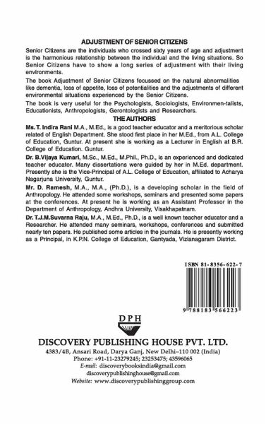 The book "Adjustment of Senior Citizens" focussed on the natural abnormalities like dementia, loss of appetite, loss of potentialities and the adjustments of different environmental situations experienced by the Senior Citizens.Senior Citizens are the individuals who crossed sixty years of age and adjustment is the harmonious relationship between the individual and the living situations. So Senior Citizens have to show a long series of adjustment with their living environments.
