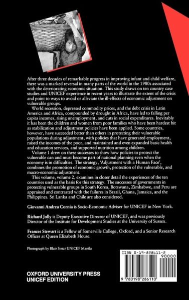 After three decades of remarkable progress, improvements in the welfare of children and other vulnerable groups in many parts of the world began to falter in the 1980s. This study draws on UNICEF work and experience of recent years to illustrate the extent of the current crisis and point to ways to alleviate the effects caused by economic adjustment. Volume 1, published in October, developed a strategy for protecting vulnerable populations during adjustment. The strategy, "Adjustment with a Human Face", combines the promotion of economic growth, protection of the vulnerable, and macro-economic adjustment. This volume, volume 2, examines in closer detail the experiences of the ten countries used as the basis for this strategy. The successes of governments in protecting vulnerable groups in South Korea, Botswana, Zimbabwe, and Peru are appraised and contrasted with the failures in Brazil, Ghana, Jamaica, and the Philippines. Sri Lanka and Chile are also considered.