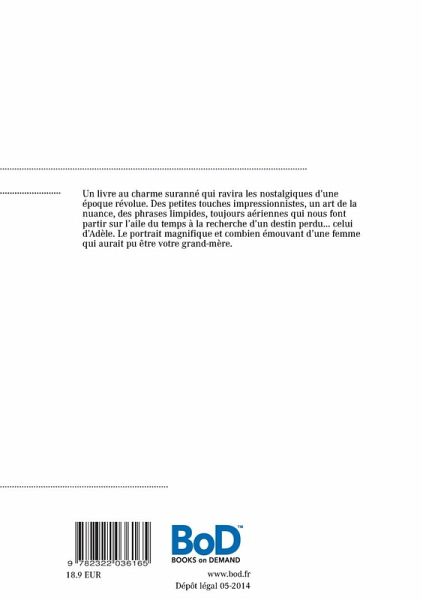 Un livre au charme suranné qui ravira les nostalgiques d'une époque révolue. Des petites touches impressionnistes, un art de la nuance, des phrases limpides, toujours aériennes qui nous font partir sur l'aile du temps à la recherche d'un destin perdu... celui d'Adèle. Le portrait magnifique et combien émouvant d'une femme qui aurait pu être votre grand-mère.
