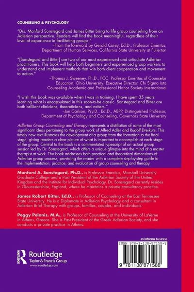 Adlerian Group Counseling and Therapy: Step-by-Step represents a distillation of some of the most significant ideas pertaining to the group work of Alfred Adler and Rudolf Dreikurs. Drs. Manford Sonstegard and James Bitter illustrate the development of a group from its formation to its final stage, giving readers a clear picture of what is important to accomplish at each stage of the group. This book also addresses many practical dimensions of the Adlerian group process, including: forming a group relationship; creating a democratic and accepting climate; conducting psychological assessments; increasing the awareness and insight of group members; translating group insight into action; methods of re-education through encouragement; and building on personal strengths discovered within the group experience.