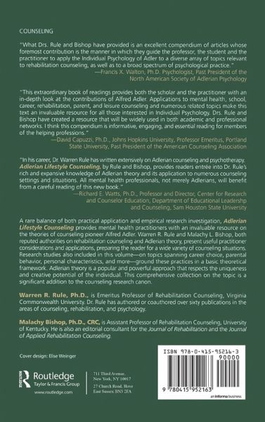 A rare balance of both practical application and empirical research investigation, Adlerian Lifestyle Counseling provides mental health practitioners with an invaluable resource on the theories of counseling pioneer Alfred Adler. Warren R. Rule and Malachy Bishop, both reputed authorities on rehabilitation counseling and Adlerian theory, present useful practitioner consideration and applications, preparing the reader for a wide variety of counseling situations. Research studies also included in this volume - on topics scanning career choice, parental behavior, personal characteristics, and more - ground these practices in a basic theoretical framework. Adlerian theory is a popular and powerful approach that respects the uniqueness and creative potential of the individual. This comprehensive collection on the topic is a significant addition to the counseling research canon.