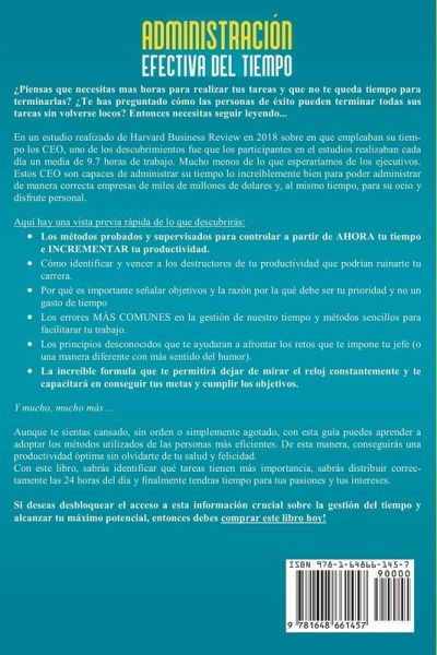 ¿Piensas que necesitas mas horas para realizar tus tareas y que no te queda tiempo para terminarlas? ¿Te has preguntado cómo las personas de éxito pueden terminar todas sus tareas sin volverse locos? Entonces necesitas seguir leyendo... En un estudio realizado de Harvard Business Review en 2018 sobre en que empleaban su tiempo los CEO, uno de los descubrimientos fue que los participantes en el estudios realizaban cada día un media de 9.7 horas de trabajo. Mucho menos de lo que esperaríamos de los ejecutivos. Estos CEO son capaces de administrar su tiempo lo increíblemente bien para poder administrar de manera correcta empresas de miles de millones de dolares y, al mismo tiempo, para su ocio y disfrute personal. Aquí hay una vista previa rápida de lo que descubrirás:Los métodos probados y supervisados para controlar a partir de AHORA tu tiempo e INCREMENTAR tu productividad. Cómo identificar y vencer a los destructores de tu productividad que podrían ruinarte tu carrera. Por qué es importante señalar objetivos y la razón por la qué debe ser tu prioridad y no un gasto de tiempo Los errores MÁS COMUNES en la gestión de nuestro tiempo y métodos sencillos para facilitarar tu trabajo. Los principios desconocidos que te ayudaran a afrontar los retos que te impone tu jefe (o una manera diferente con más sentido del humor). La increíble formula que te permitirá dejar de mirar el reloj constantemente y te capacitará en conseguir tus metas y cumplir los objetivos. Y mucho, mucho más ... Aunque te sientas cansado, sin orden o simplemente agotado, con esta guía puedes aprender a adoptar los métodos utilizados de las personas más eficientes. De esta manera, conseguirás una productividad óptima sin olvidarte de tu salud y felicidad. Con este libro, sabrás identificar qué tareas tienen más importancia, sabrás distribuir correctamente las 24 horas del día y finalmente tendras tiempo para tus pasiones y tus intereses. Si deseas desbloquear el acceso a esta información crucial sobre la gestión del tiempo y alcanzar tu máximo potencial, entonces debes comprar este libro hoy!