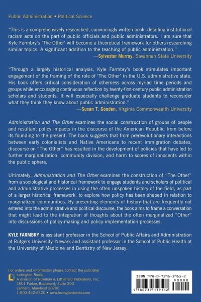 The American state, with its various instruments of policy-making and implementation, has found itself wrestling with various policy challenges related to matters of marginalization. Administration and the Other uses historical cases to examine the social construction of groups in American policy and proposes using the various lessons that are often unspoken in discussions of the history and evolution of the field to launch a discourse of inclusion and connectivity.