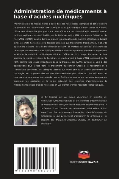 "Administration de médicaments à base d'acides nucléiques: Triomphes et défis" explore le potentiel de l'interférence ARN (ARNi) en tant que thérapie ciblée contre le cancer, offrant une alternative plus précise et plus efficace à la chimiothérapie conventionnelle. Le livre explique comment l'ARNi, par le biais de petits ARN interférents (siRNA) et de microARN (miRNA), peut réduire au silence les oncogènes de manière sélective, réduisant ainsi les effets hors cible et la toxicité associés aux traitements traditionnels. Il aborde également les défis liés à l'administration de l'ARN, en mettant l'accent sur des avancées telles que les nanoparticules lipidiques (LNP) et d'autres systèmes novateurs conçus pour améliorer la stabilité, la biodisponibilité et l'efficacité du ciblage. En outre, le livre souligne le succès clinique du Patisiran, un médicament à base d'ARNi approuvé par la FDA, comme une étape importante dans la thérapie par l'ARNi, ouvrant la voie à des applications plus larges dans le traitement du cancer. Grâce à la recherche et à l'innovation continues, les thérapies basées sur l'ARNi offrent un avenir prometteur en oncologie, en proposant des options thérapeutiques plus sûres et plus efficaces qui pourraient révolutionner les soins du cancer. Ce livre se penche sur ces avancées tout en explorant les obstacles et le vaste potentiel des systèmes d'administration de médicaments à base d'acide nucléique en vue d'améliorer les résultats thérapeutiques.
