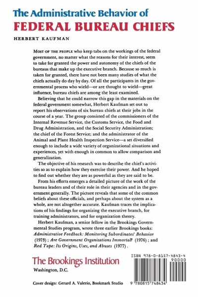 " Most of the people who keep tabs on the workings of the federal government, no matter what the reasons for their interest, seem to take for granted the power and autonomy of the chiefs of the bureaus that make up the executive branch. Because so much is taken for granted, there have not been many studies of what the chiefs actually do day by day. Of all the participants in the governmental process who wield--or are thought to wield--great influence, bureau chiefs are among the least examined. Believing that he could narrow this gap in the materials on the federal government somewhat, Herbert Kaufman set out to report his observations of six bureau chiefs at their jobs in the course of a year. The group consisted of the commissioners of the Internal Revenue Service, the Customs Service, the Food and Drug Administration, and the Social Security Administration; the chief of the Forest Service; and the administrator of the Animal and Plant Health Inspection Service--a set diversified enough to include a wide variety of organizational situations and experiences, yet with enough in common to allow comparison and generalization. The objective of his research was to describe the chief's activities so as to explain how they exercise their power. And he hoped to find out whether they are as powerful as they are said to be. From his efforts emerges a detailed picture of the work of the bureau leaders and of their role in their agencies and in the government generally. The picture reveals that some of the common beliefs about these officials, and perhaps about the system as a whole, are not altogether accurate. Kaufman traces the implications of his findings for organizing the executive branch, for training administrators, and for organization theory."