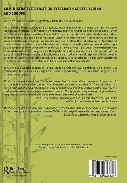 Administrative litigation systems are a rapidly developing legal field in many countries. This book provides a comparative study of the administrative litigation systems in China, Hong Kong, Taiwan and Macao, as well as a number of selected European countries that covers both states with an advanced rule of law and new democracies. Despite the different historical backgrounds and the broader context which has cultivated each individual system, this collective work illustrates the common characteristics of the rapid development of administrative litigation systems since the 1990s as a consequence of the advancement of the rule of law at a global level. All of the contributors have addressed a wide array of key issues in their particular jurisdiction, including court jurisdiction, the scope of judicial review, grounds of litigation claims and mediation in judicial process. Whilst pointing out the shortcomings and challenges which are faced by each jurisdiction, the book offers both ideas and inspiration on how the systems can learn from, and influence each other. This book is essential reading for those studying Chinese law, administrative litigation and comparative law, as well as judges and lawyers specialising in administrative litigation, and administrative courts.