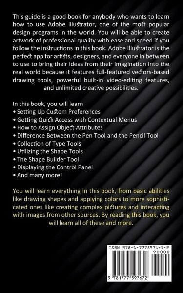 This guide is a good book for anybody who wants to learn how to use Adobe Illustrator, one of the most popular design programs in the world. You will be able to create artwork of professional quality with ease and speed if you follow the instructions in this book. Adobe Illustrator is the perfect app for artists, designers, and everyone in between to use to bring their ideas from their imagination into the real world because it features full-featured vectors-based drawing tools, powerful built-in video-editing features, and unlimited creative possibilities. In this book, you will learnSetting Up Custom Preferences Getting Quick Access with Contextual Menus How to Assign Object Attributes Difference Between the Pen Tool and the Pencil Tool Collection of Type Tools Utilizing the Shape Tools The Shape Builder Tool Displaying the Control Panel And many more! You will learn everything in this book, from basic abilities like drawing shapes and applying colors to more sophisticated ones like creating complex pictures and interacting with images from other sources. By reading this book, you will learn all of these and more.