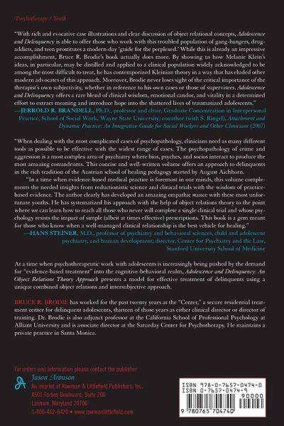 This book applies modern object-relations theory to a population for which the 'treatment du jour' is increasingly cognitive-behavioral. Taking his lead from the delinquent adolescents in his practice, he presents a treatment approach in which adolescents are related to as people, rather than as transitory objects passing through a 'stage.' The book presents theory and case examples in a dialectical relationship, illuminating the seamlessness of theory and application.