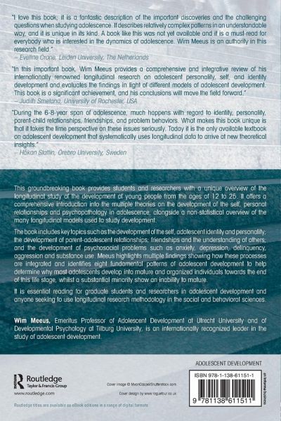 This groundbreaking book provides students and researchers with a unique overview of the longitudinal study of the development of young people from the ages of 12 to 25. It offers a comprehensive introduction into the multiple theories on the development of the self, personal relationships and psychopathology in adolescence, alongside a non-statistical overview of the many longitudinal models used to study development. The book includes key topics such as the development of the self, adolescent identity and personality; the development of parent-adolescent relationships; friendships and the understanding of others; and the development of psychosocial problems such as anxiety, depression, delinquency, aggression, and substance use. Meeus highlights multiple findings showing how these processes are integrated and identifies eight fundamental patterns of adolescent development to help determine why most adolescents develop into mature and organized individuals towards the end of this life stage, whilst a substantial minority show an inability to mature. It is essential reading for graduate students and researchers in adolescent development and anyone seeking to use longitudinal research methodology in the social and behavioral sciences.