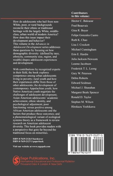 Paths to Adulthood - R Montemayor Adolescent Diversity in Contemporary America Competence among Urban Adolescents in Poverty - H Yoshikawa and E Seidman Multiple Forms, Contexts and Developmental Processes Rural Youth - L Crockett, M Shanahan and J Jackson-Newsom Ecological and Life Course Perspectives Growing Up in Appalachia - S Wilson and G Peterson Ecological Influences on Adolescent Development Indian Adolescence - F Beauvais Opportunity and Challenge Healthy Adjustment in Mexican American and Other Hispanic Adolescents - F Castro, G Boyer and H Balcazar Asian American Adolescents - F Leong, R Chato and E Hardin A Research Review to Dispel the Model Minority Myth Ecological Correlates of the Social and Emotional Adjustment of African American Adolescents - R Taylor, L Jacobsen and D Roberts Conceptual and Methodological Issues in Studying Minority Adolescents - M Cunningham and M Beale Spencer The Variety of Adolescent Experiences - R Montemayor