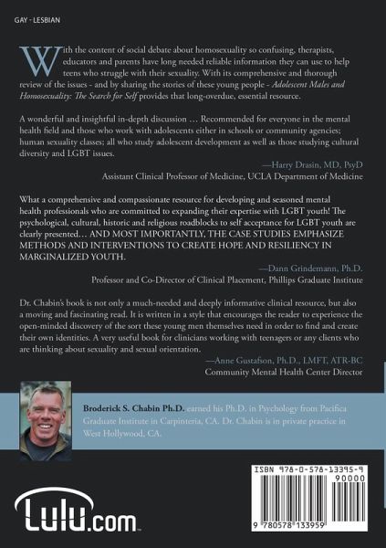 With the content of social debate about homosexuality so confusing, therapists, educators and parents have long needed reliable information they can use to help teens who struggle with their sexuality. With its comprehensive and thorough review of the issues - and by sharing the stories of these young people - Adolescent Males and Homosexuality: The Search for Self provides that long-overdue, essential resource. A wonderful and insightful in-depth discussion ... Recommended for everyone in the mental health field and those who work with adolescents either in schools or community agencies; human sexuality classes; all who study adolescent development as well as those studying cultural diversity and LGBT issues. -Harry Drasin, MD, PsyD Assistant Clinical Professor of Medicine, UCLA Department of Medicine